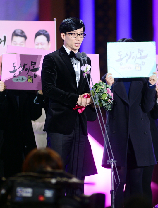 유재석은 "김병만과 같이 대상을 받아서 기쁘다. 농담 삼아 욕심이 난다 했지만 '런닝맨'은 여러분의 기대를 채우지 못한 게 사실이다. 올해 모자란 웃음은 무슨 일이 있어도 2016년에 꼭 채우겠다"며 "'동상이몽'이란 멋진 프로그램에도 감사하다"고 고마움을 전했다.