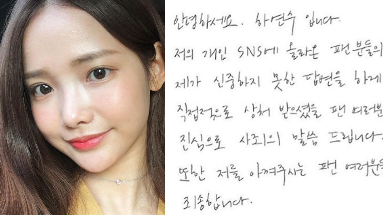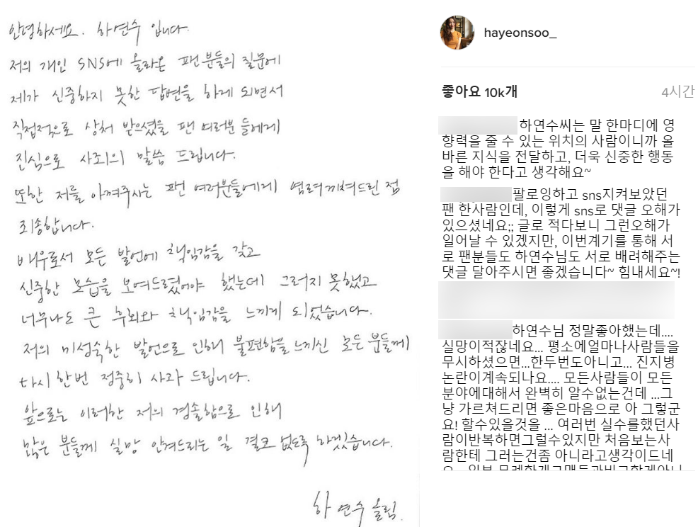 배우 하연수가 댓글 논란이 거세지자 자필 사과문을 게재했습니다.