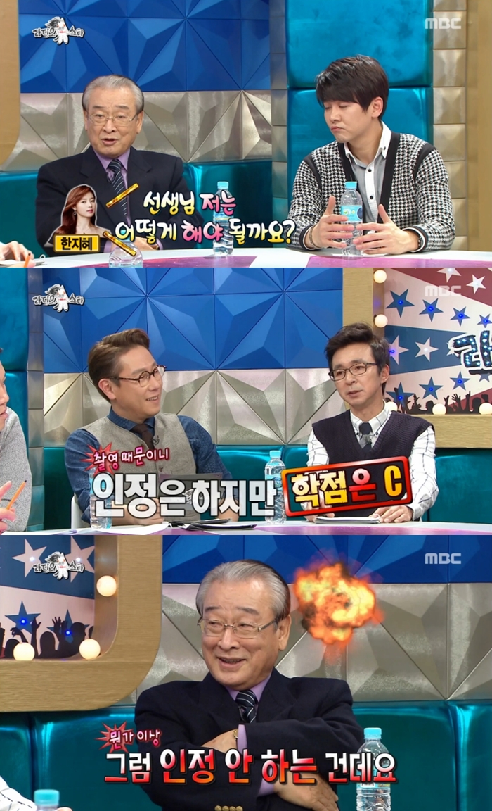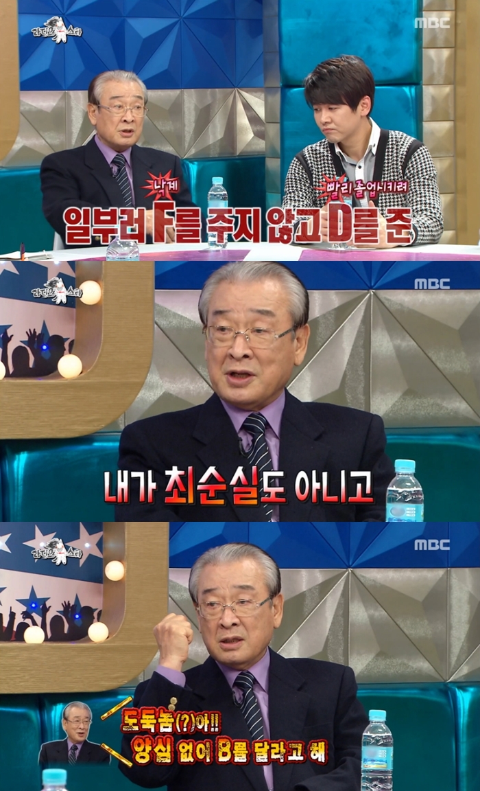 이순재는 "다른 학생들에게 악영향을 주기 때문에 빨리 졸업시키려 일부러 D학점을 줬다. 그랬더니 전화를 해 B학점으로 올려 달라고 하더라. 내가 최순실도 아니고"라며 "양심 없이 B를 달라고 한다고 도둑놈이라고 했다"고 덧붙여 웃음을 자아냈다.