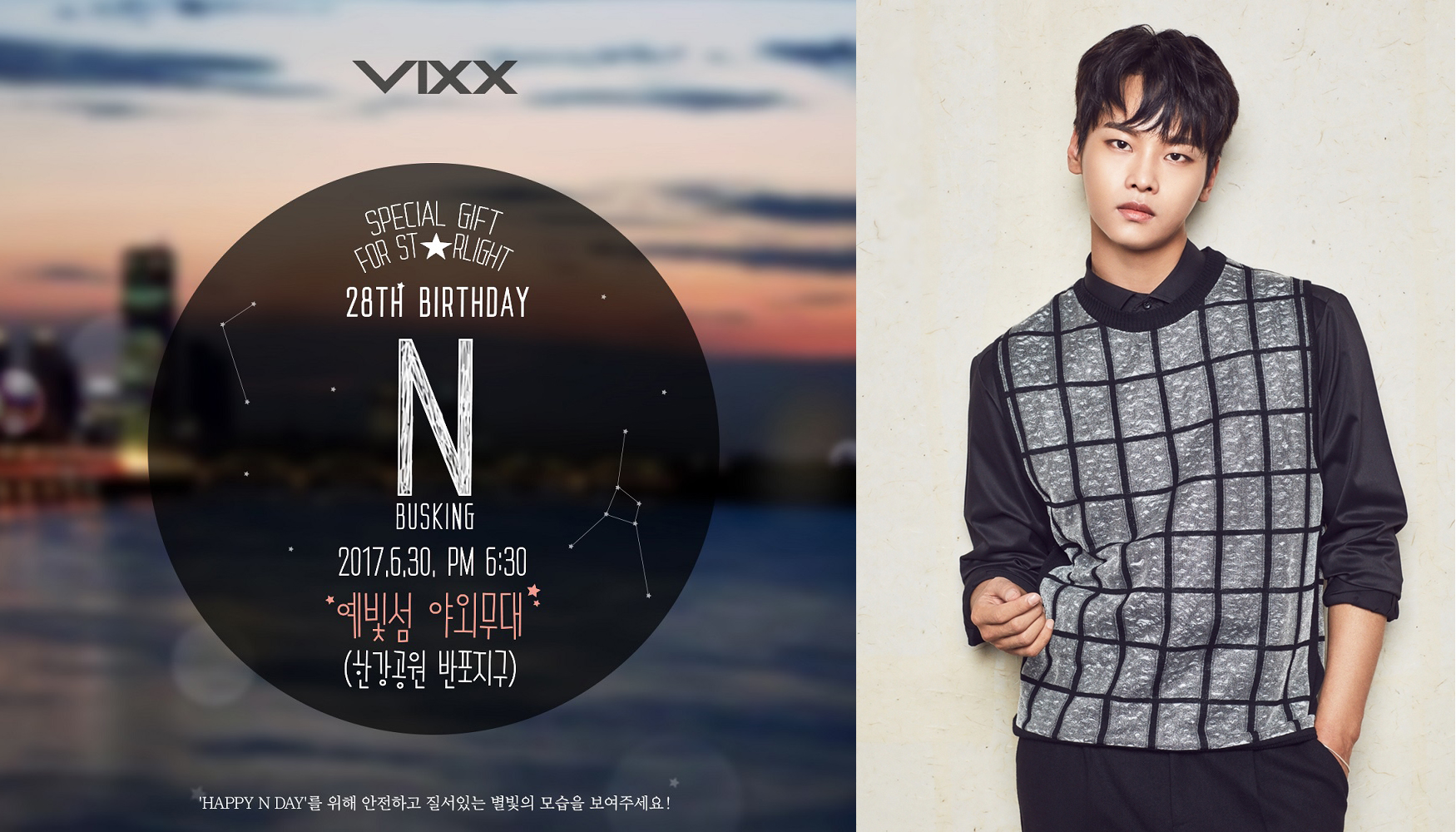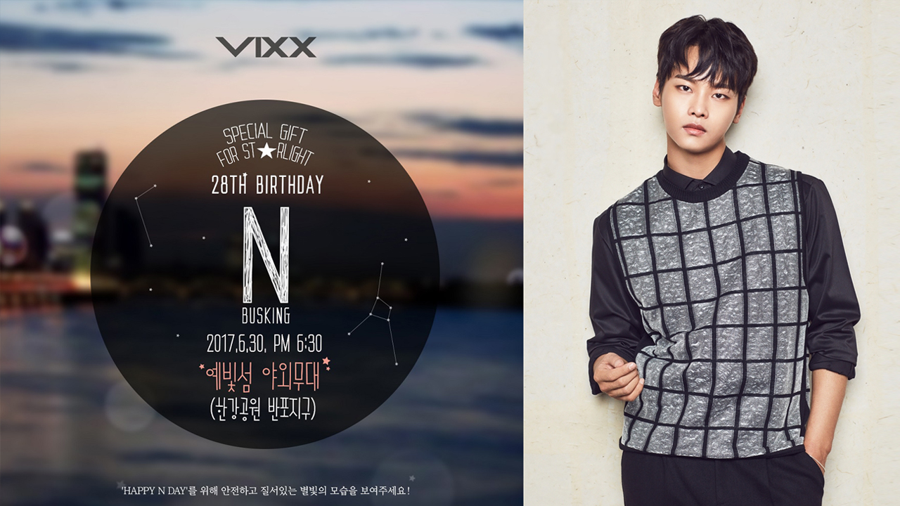 30일 빅스의 공식 소셜 채널을 통해 빅스의 리더 엔이 6월 30일 28번째 생일을 기념해 오후 6시 30분부터 서울 한강공원 반포지구에 위치한 예빛섬 야외 무대에서 깜짝 버스킹을 한다고 기습 예고했다.