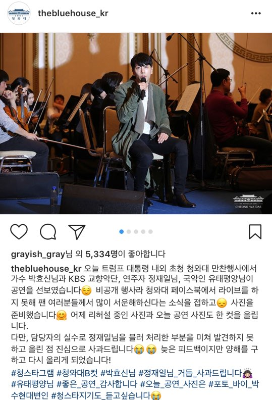 지난 8일 청와대는 공식 인스타그램을 통해 "오늘 트럼프 대통령 내외 초청 청와대 만찬 행사에서 가수 박효신 님과 KBS 교향악단, 연주자 정재일 님, 국악인 유태평양 님이 공연을 선보였다"라며 "비공개 행사라 청와대 페이스북에서 라이브를 하지 못해 팬 여러분들께서 많이 서운해하신다는 소식을 접하고 사진을 준비했다. 어제 리허설 중인 사진과 오늘 공연 사진도 한 멋 올린다"고 설명했다.