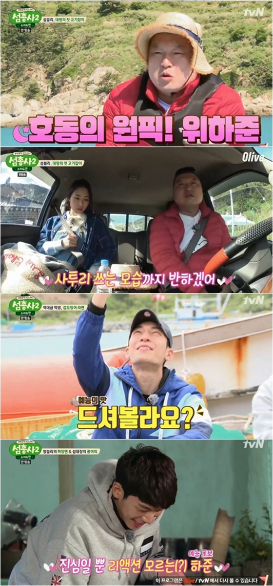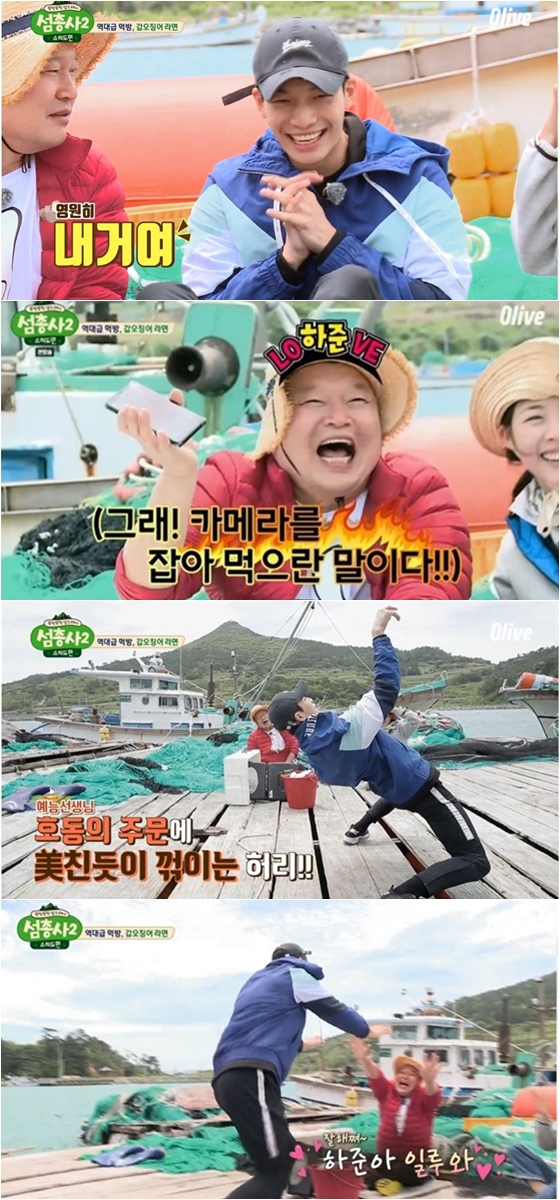 이후 강호동은 직접 손질한 갑오징어로 라면을 끊였다. 위하준은 라면이 익는 동안 펼쳐진 상황극을 통해 남다른 예능감을 보여준 데 이어, 선착장 위에서 화끈한 댄스 퍼레이드를 펼치며 강호동을 흐뭇하게 했다.