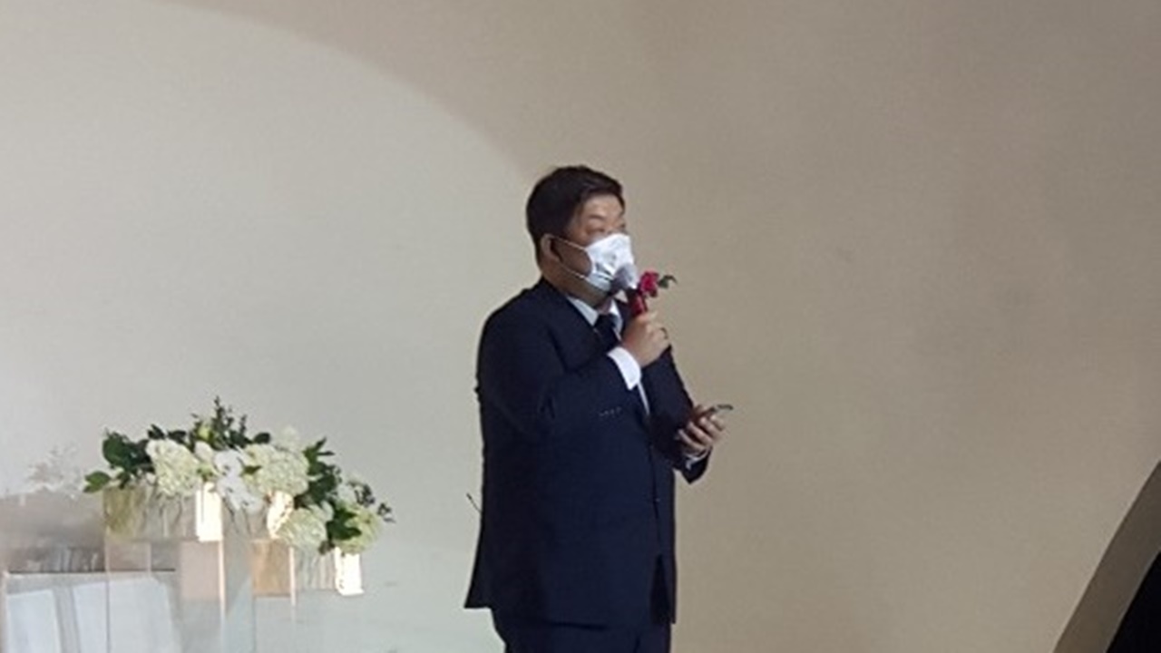 이날 검은 정장에 블랙 타이를 입고 단상 앞에선 유민상은 "정말 축하한다. 우리 동기 중 영원히 깨지지 않을 것 같던 유민상, 신봉선 삼각 트라이앵글을 깨줘서 우리도 해낼 수 있다는 생각을 하게 해줬다"라고 말했다.