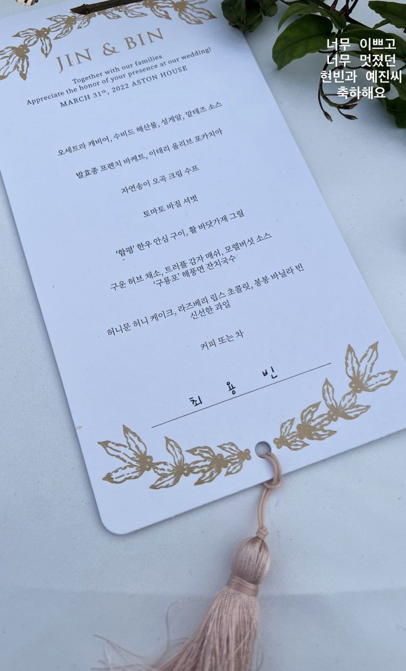 결혼식이 끝나자 초대 받은 사진작가 최용빈 씨는 자신의 SNS에 "너무 이쁘고 너무 멋졌던 현빈과 예진씨 축하해요"란 글과 함께 메뉴판 사진을 올렸다.