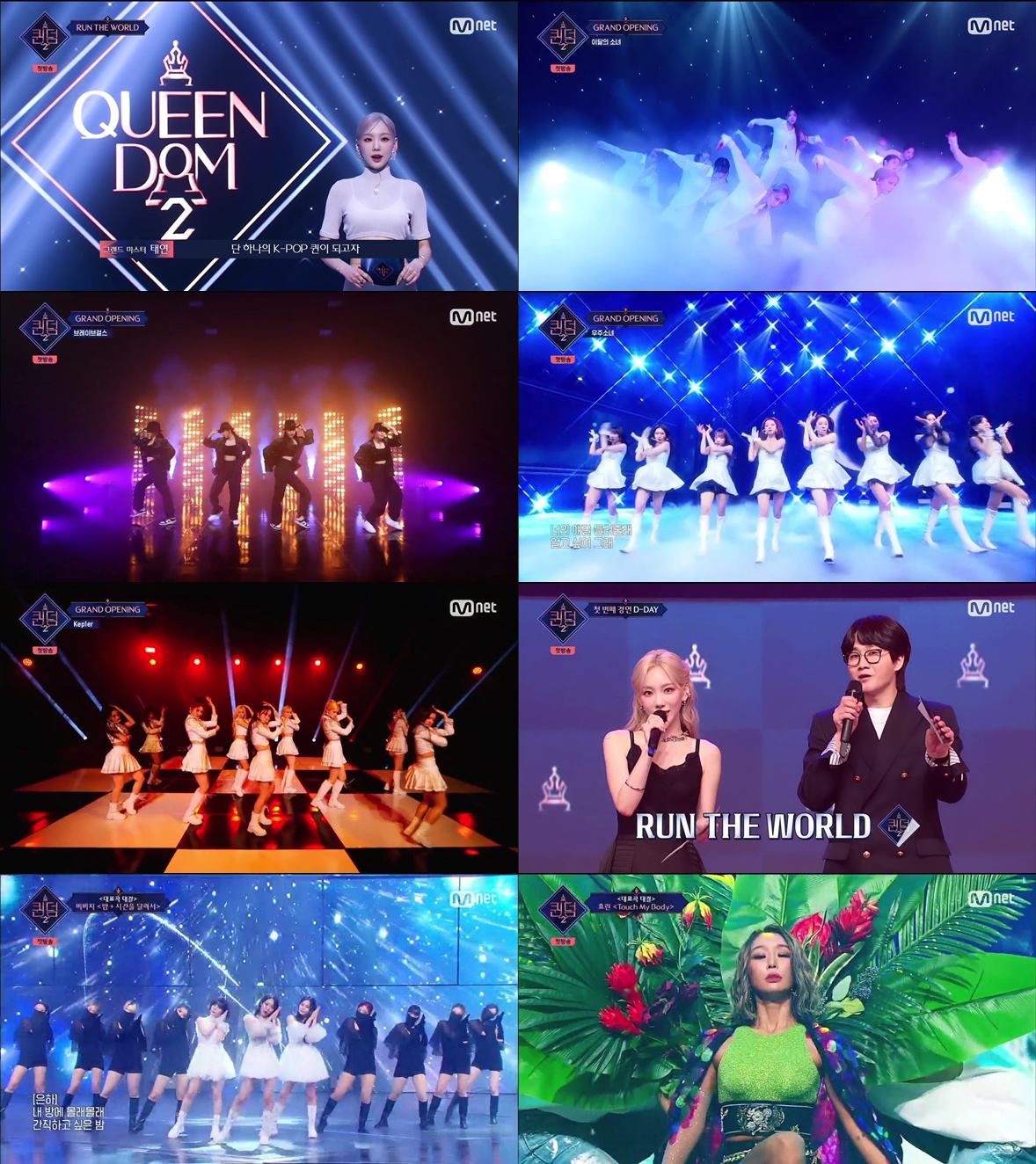 '퀸덤2' 1회 방송은 비비지, 이달의 소녀, 브레이브걸스, 우주소녀, 케플러, 효린 씨가 차례로 자신들의 매력을 가득 담은 오프닝 퍼포먼스를 선보이며 화려한 시작을 알렸다. 또, 그랜드 마스터 태연은 첫 번째 서바이벌 프로그램 진행임에도 불구하고 차분한 목소리로 분위기를 휘어잡으며 '퀸덤2'의 무게 중심 역할을 톡톡히 했다. 퀸 매니저 이용진 씨 역시 재치 있는 입담으로 재미를 더했다.