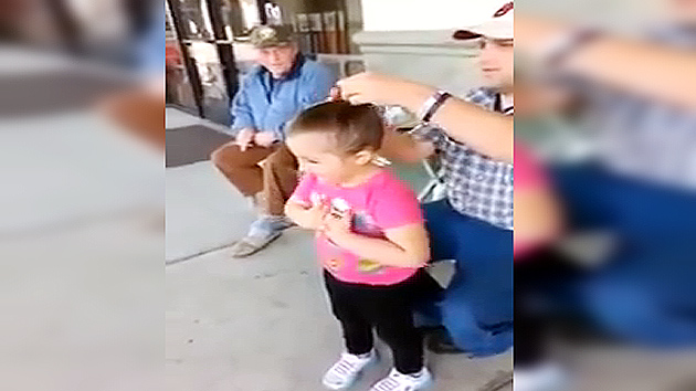 아빠는 먼저 딸의 머리카락을 한 손에 전부 모아 쥡니다. 그리고는 딸에게 “Turn!(돌아!)”라고 말합니다.