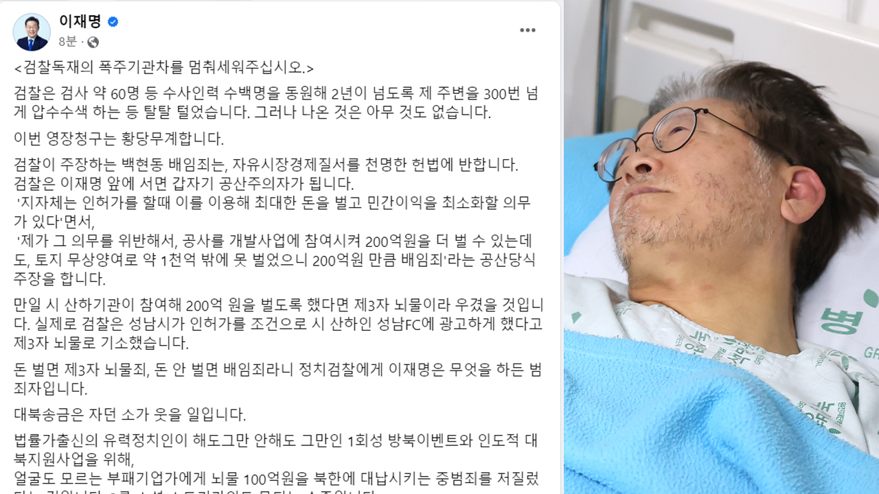 이어 정치의 최일선에 선 검찰이 자신들이 조작한 상상의 세계에 꿰맞춰 자신을 감옥에 가두겠다고 한다며, 이는 명백한 정치 보복이자 검찰권 남용이라고 주장했습니다.