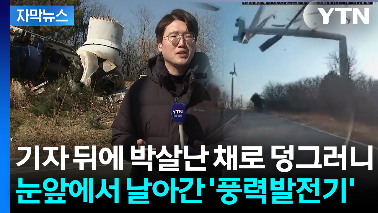 당시 화면을 보면, 발전기 중간 부분이 갑작스레 꺾이기 시작하더니, 곧 완전히 부러져 도로 쪽으로 넘어지는데요.
