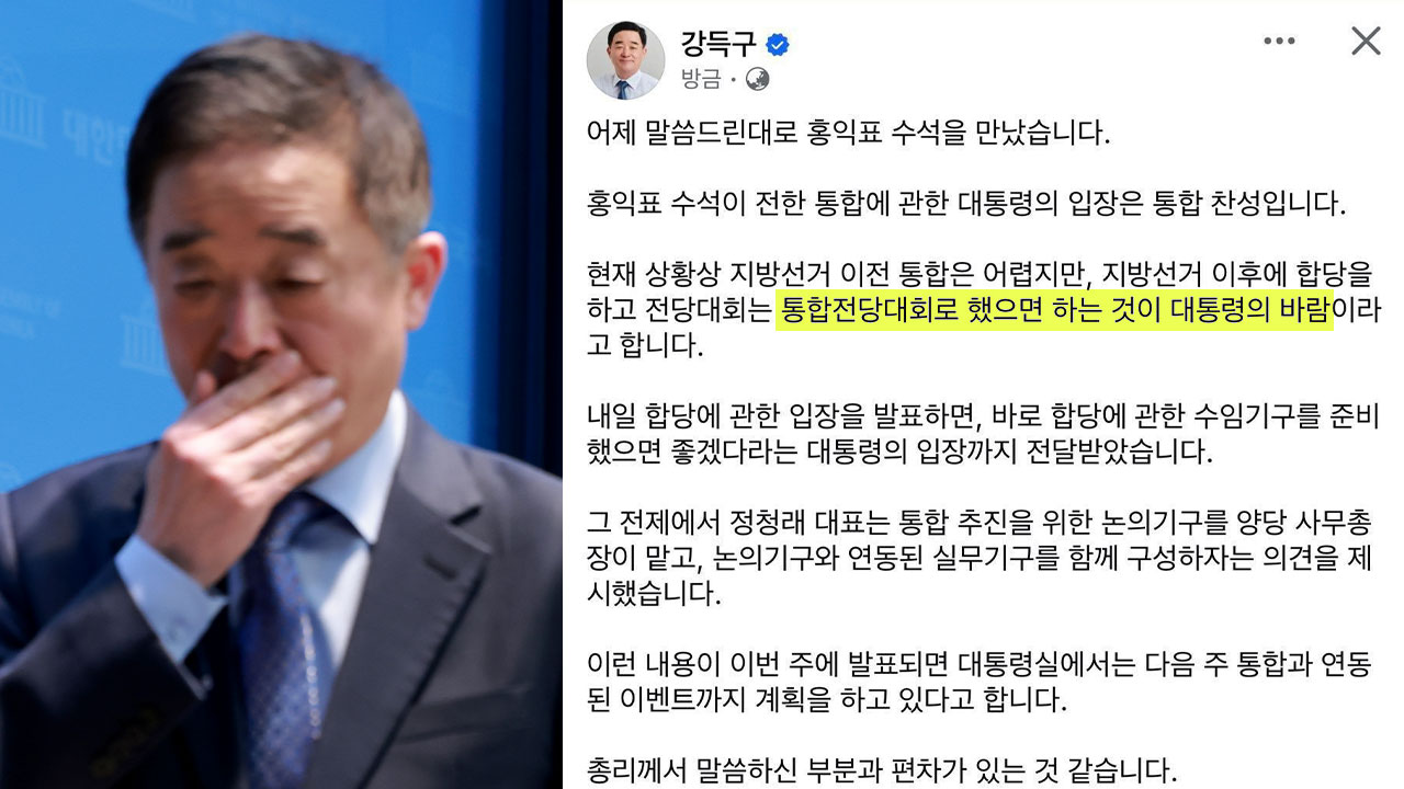 ◇ 이민찬>추진이 될 가능성이 높아졌습니다. 당초에는 지방선거 이후 8월 민주당 전당대회가 있기 때문에 또다시 명청대전이 살아나지 않을까 이런 생각을 했습니다. 그런데 어제 청와대의 뜻이 전달된 것이 SNS를 통해서 밝혀졌잖아요. 강득구 최고위원이 홍익표 정무수석을 만나고 그 내용이 공개됐습니다. 그 내용을 보면 대통령의 뜻은 지방선거 이후에 합당을 하는 것이고 통합전당대회를 치르는 것이다. 이것이 홍익표 정무수석을 통해 여당 지도부에 전달된 내용입니다. 명백히 이 부분은 당무 개입이라고 볼 수 있는 부분이고 그렇기 때문에 민주당 내에서도 친명진영에서도 이 부분을 극렬하게 반대할 수는 없는 상황이 됐다, 이렇게 보입니다.
