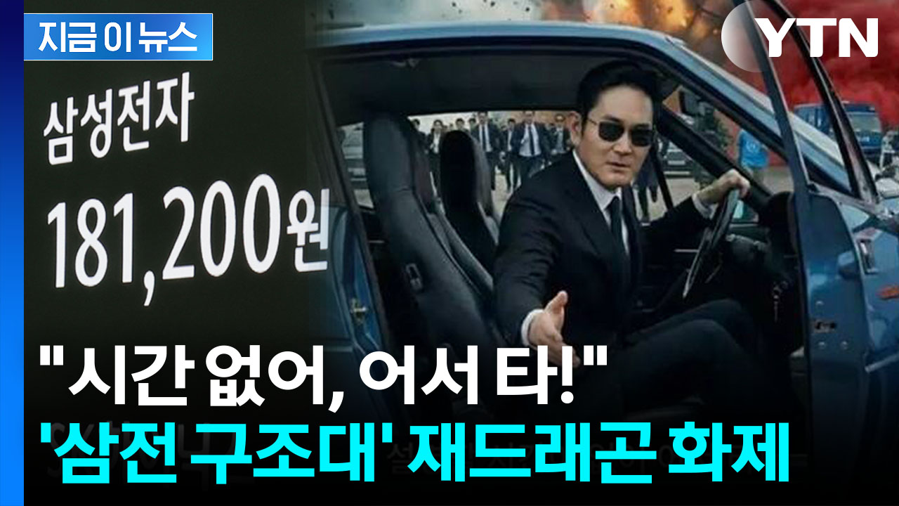 불길이 치솟는 배경 속 스포츠카에 앉은 이 회장이 “설명할 시간 없어, (삼성전자 주식에) 어서 타”라고 외치는 모습으로, 이 회장을 ‘구조대’에 빗댄 밈으로 해석되고 있습니다.