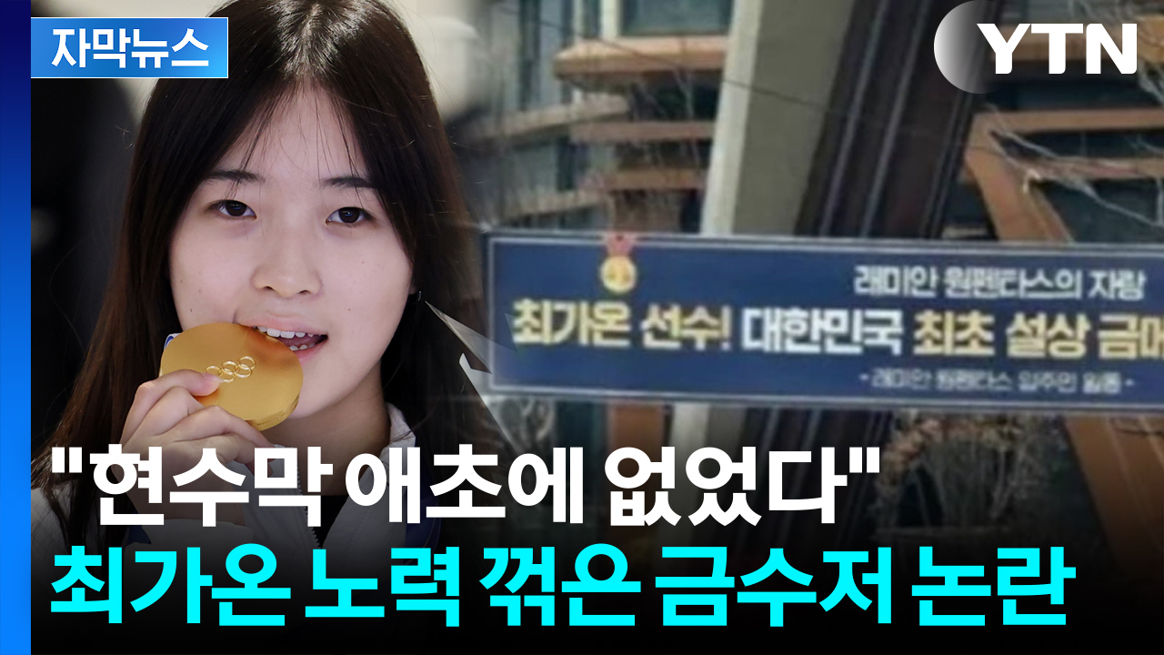 설상 종목 첫 금메달을 딴 스노보드 최가온 선수의 아파트 축하 현수막을 놓고 논란이 계속되고 있습니다.