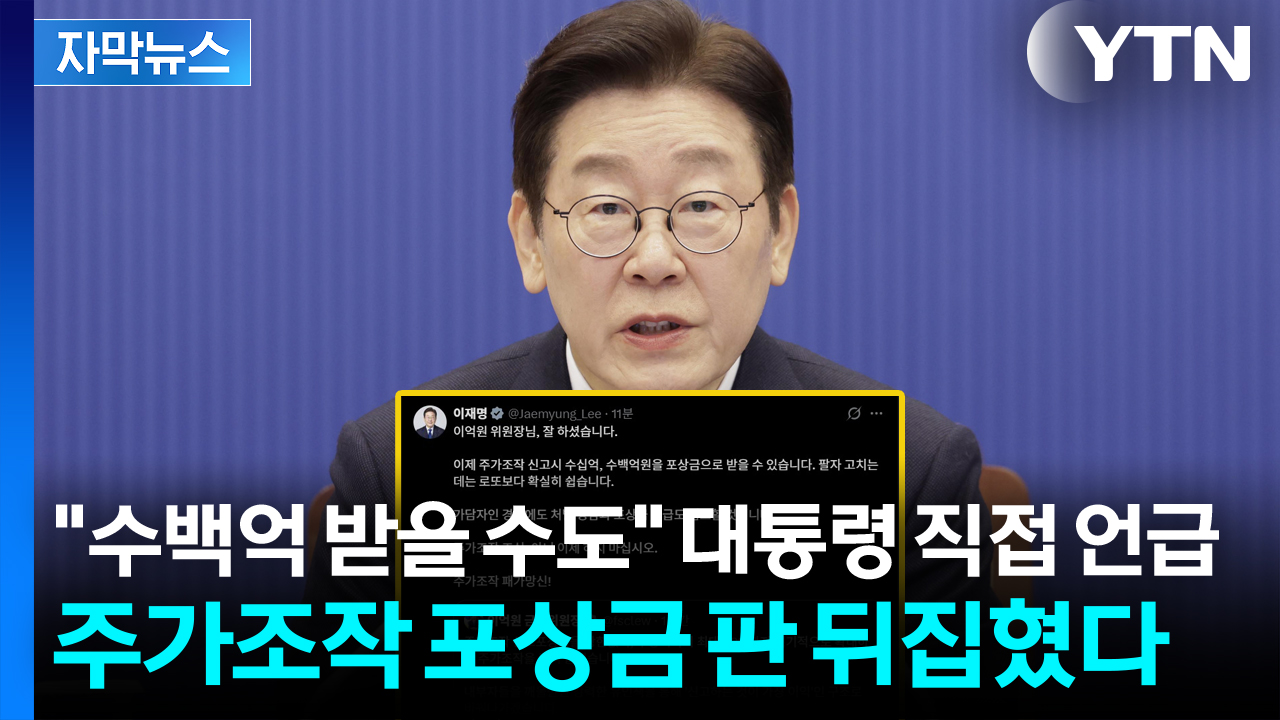 이 대통령은 어제(25일) SNS를 통해 '이억원 금융위원장님, 잘하셨습니다'라고 적은 뒤 주가조작을 신고하면 수십억, 수백억의 포상금을 받을 수 있다며 팔자 고치는 데는 확실히 로또보다 쉽다고 강조했습니다.