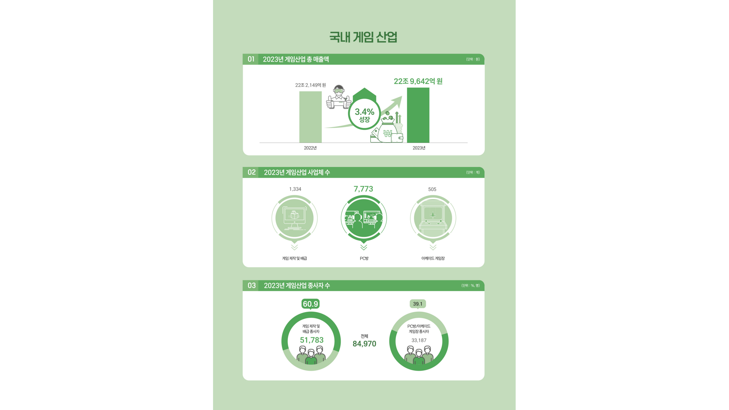 보고서에 따르면 2023년 국내 게임산업 매출은 전년 대비 3.4% 증가한 22조 9,652억 원으로 집계됐다. 수출액은 83억 9,400만 달러(한화 약 10조 9,785억 원)로 6.5% 줄었다. 종사자 수는 8만 4,970명으로 전년보다 0.7% 늘었다. 게임 제작 및 배급 분야 종사자는 5만 1,783명(종사자 중 60.9%)이었고 게임 유통 분야 종사자는 3만 3,187명(종사자 중 39.1%)이었다.