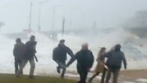 공개된 영상에는 바닷가에 오손도손 모여 해일이 밀려오는 모습을 감상하는 관광객들의 모습이 담겨 있습니다.