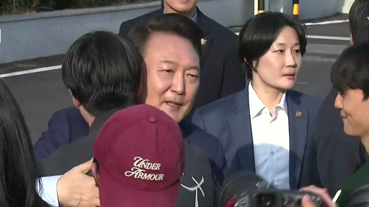 밝은 표정으로 인파를 향해 손을 흔든 윤 전 대통령은 앞줄에 선 대학생들을 일일이 끌어안고, 토닥였습니다.