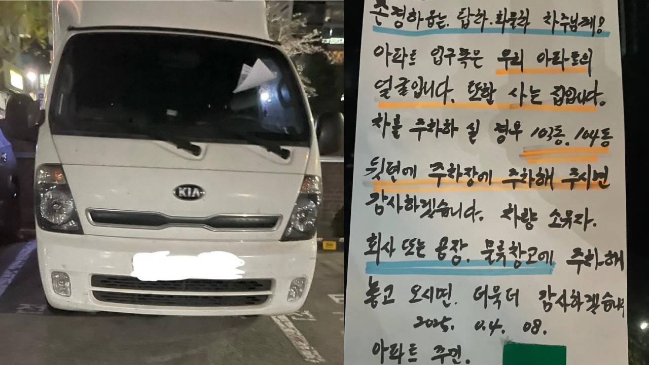 광주 북구의 한 아파트에 주차된 화물차에 붙은 손 편지를 두고 온라인에서 논란이 벌어졌다.