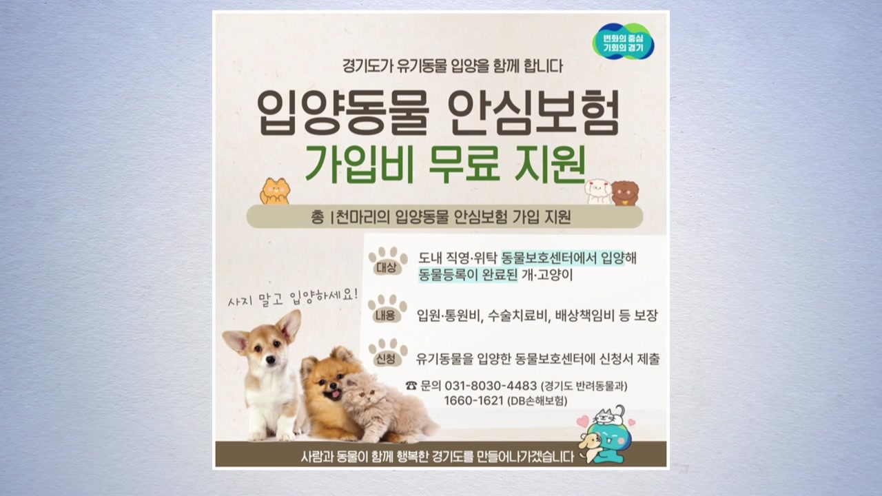지원 대상은 지난 1월 1일부터 경기지역 도·시군 직영 또는 위탁 동물보호센터에서 입양된, 동물 등록이 완료된 개와 고양이로 유기동물을 입양한 공공 동물보호센터에서 가입 신청을 할 수 있습니다.